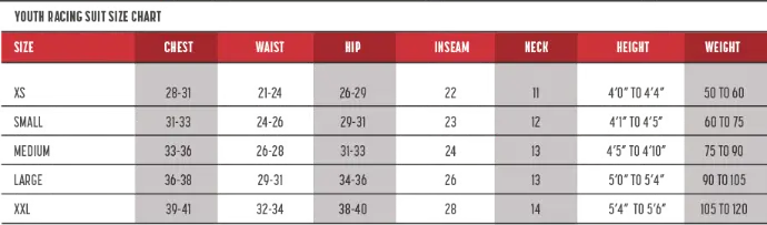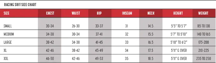 Custom Racing Suit Measurement Chart